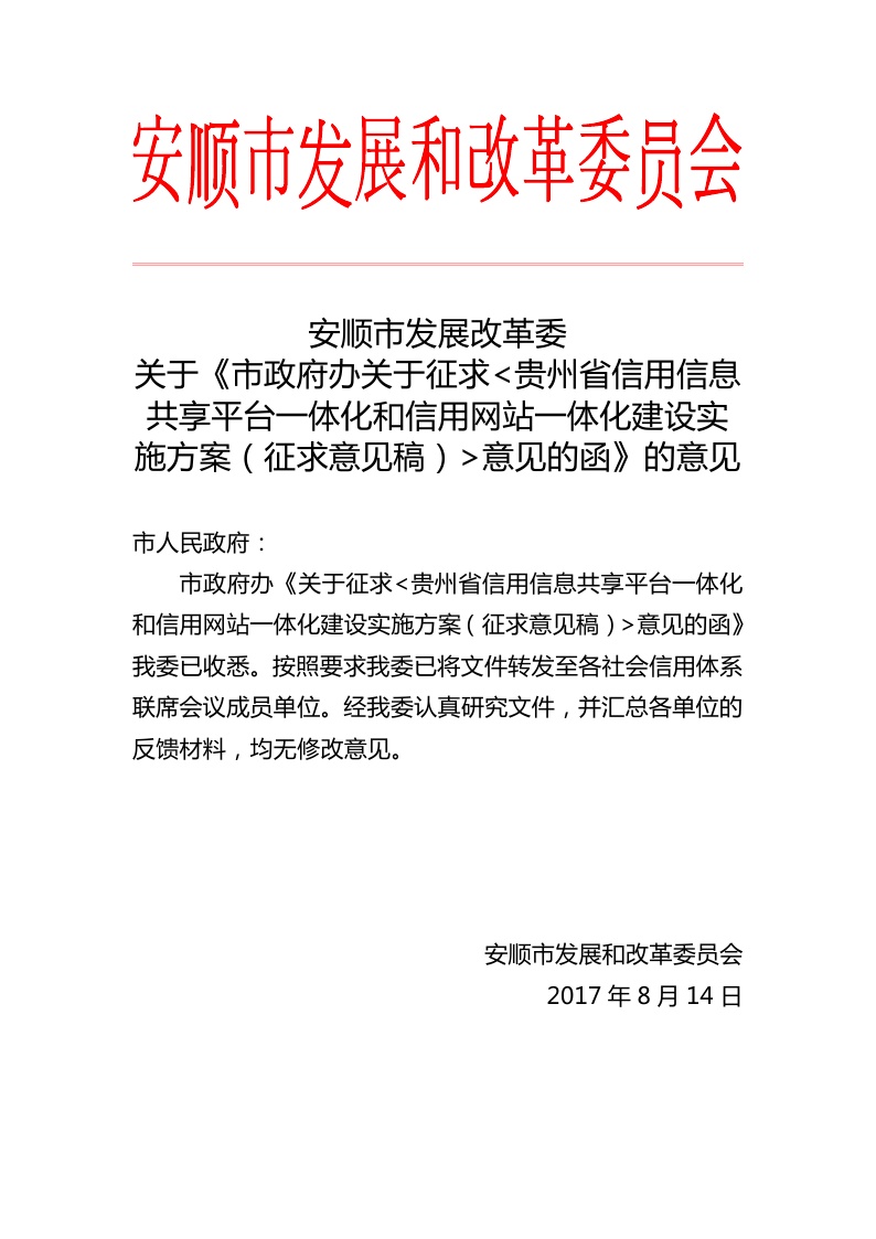 安顺市发改委关于《市政府办关于征求贵州省信用信息共享平台一体化和信用网站一体化建设实施方案(征求意见稿)意见的函》的复函
